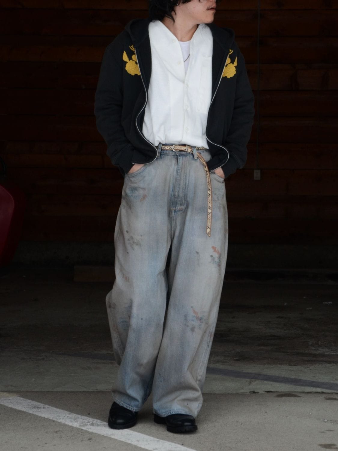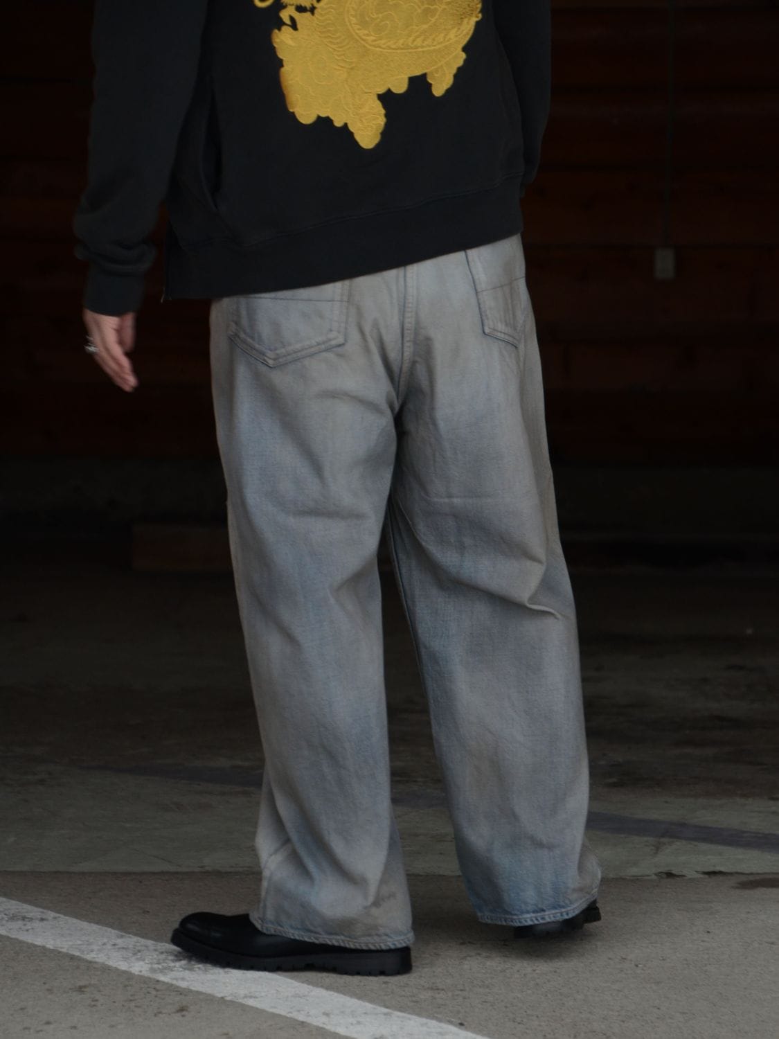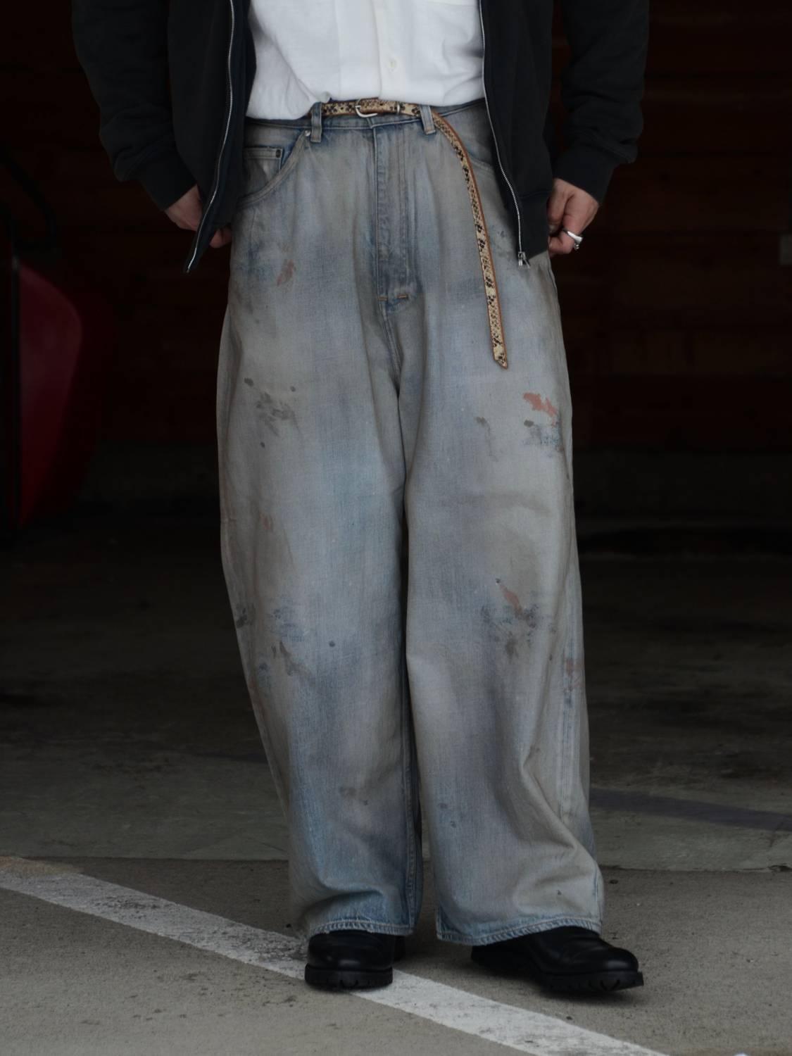 大きく生地分量を持たせたワイドさに、裾に向かって美しく落ちる#05。大胆で迫力のある太さで主張しながら、着用時にはとても綺麗な収まりを見せ立体感の美しいシルエットとなっております。